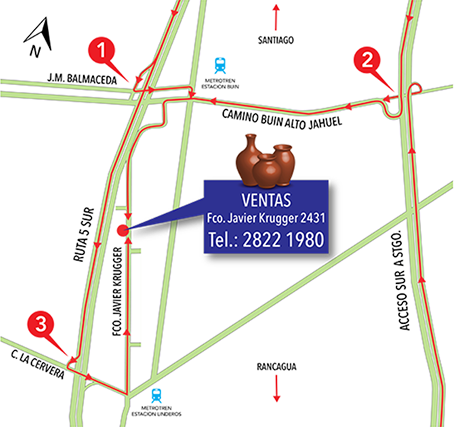 Por Ruta 5 Sur, Tomar salida Buin Alto Jahuel o Linderos Cervera hacia el oriente hasta llegar hasta Francisco Javier Krugger.